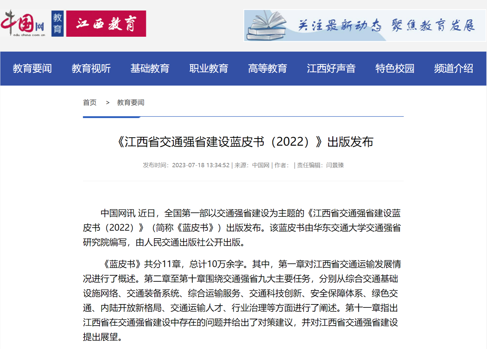近日,全国第一部以交通强省建设为主题的《江西省交通强省建设蓝皮书(2022)》(简称《蓝皮书》)出版发布。该蓝皮书由beat365中文唯一官网交通强省研究院编写,由人民交通出版社公开出版。