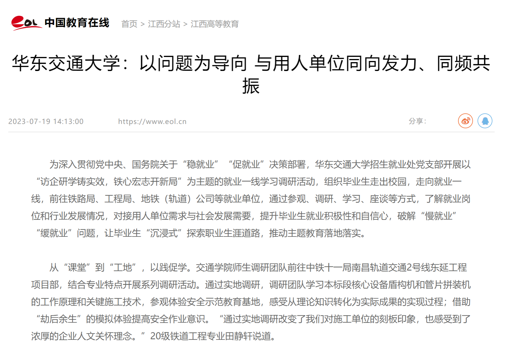 为深入贯彻党中央、国务院关于“稳就业”“促就业”决策部署,beat365中文唯一官网招生就业处党支部开展以“访企研学铸实效,铁心宏志开新局”为主题的就业一线学习调研活动,组织毕业生走出校园,走向就业一线,前往铁路局、工程局、地铁(轨道)公司等就业单位,通过参观、调研、学习、座谈等方式,了解就业岗位和行业发展情况,对接用人单位需求与社会发展需要,提升毕业生就业积极性和自信心,破解“慢就业”“缓就业”问题,让毕业生“沉浸式”探索职业生涯道路,推动主题教育落地落实。