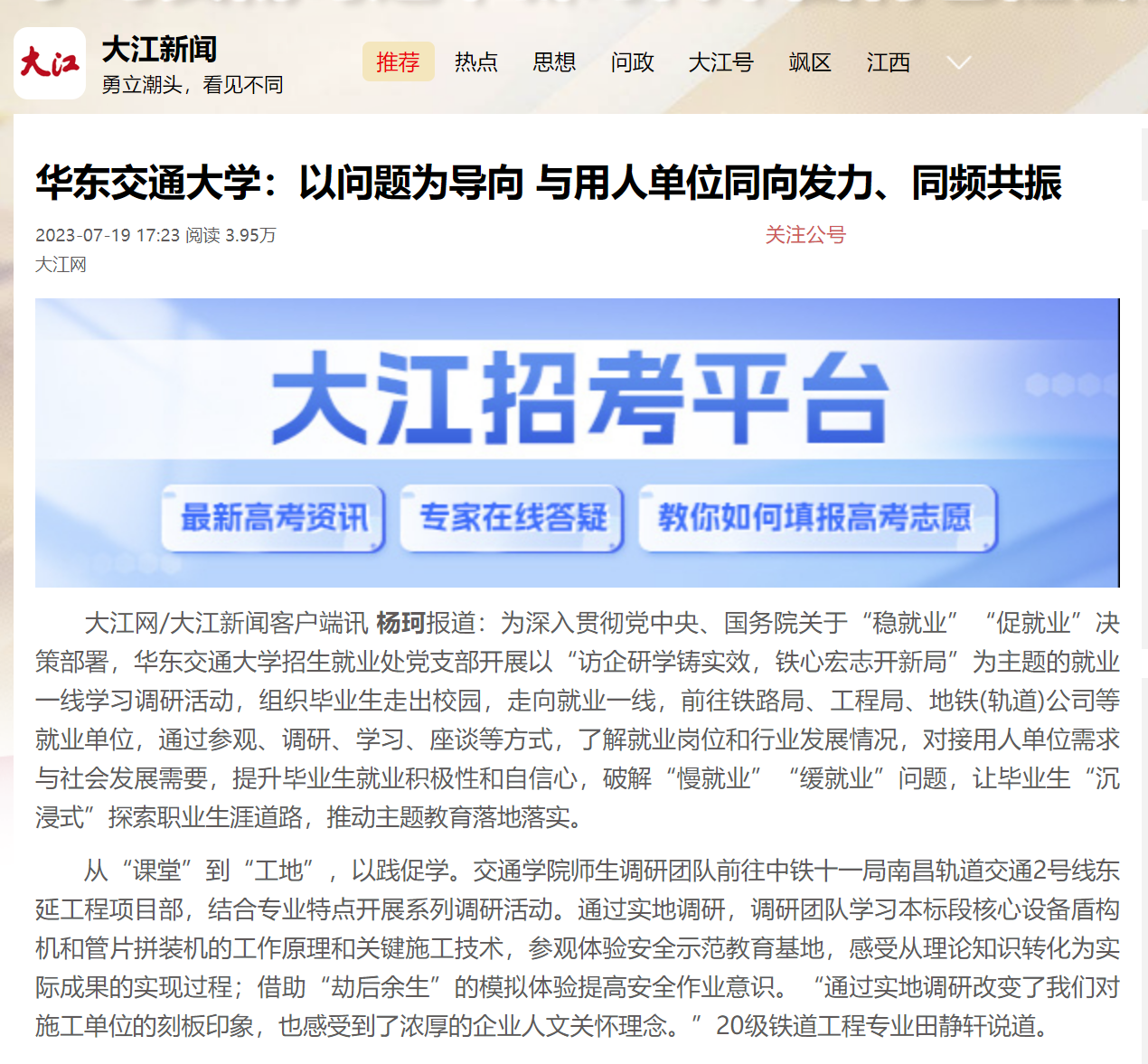 从“课堂”到“工地”,以践促学。交通学院师生调研团队前往中铁十一局南昌轨道交通2号线东延工程项目部,结合专业特点开展系列调研活动。通过实地调研,调研团队学习本标段核心设备盾构机和管片拼装机的工作原理和关键施工技术,参观体验安全示范教育基地,感受从理论知识转化为实际成果的实现过程;借助“劫后余生”的模拟体验提高安全作业意识。“通过实地调研改变了我们对施工单位的刻板印象,也感受到了浓厚的企业人文关怀理念。”20级铁道工程专业田静轩说道。