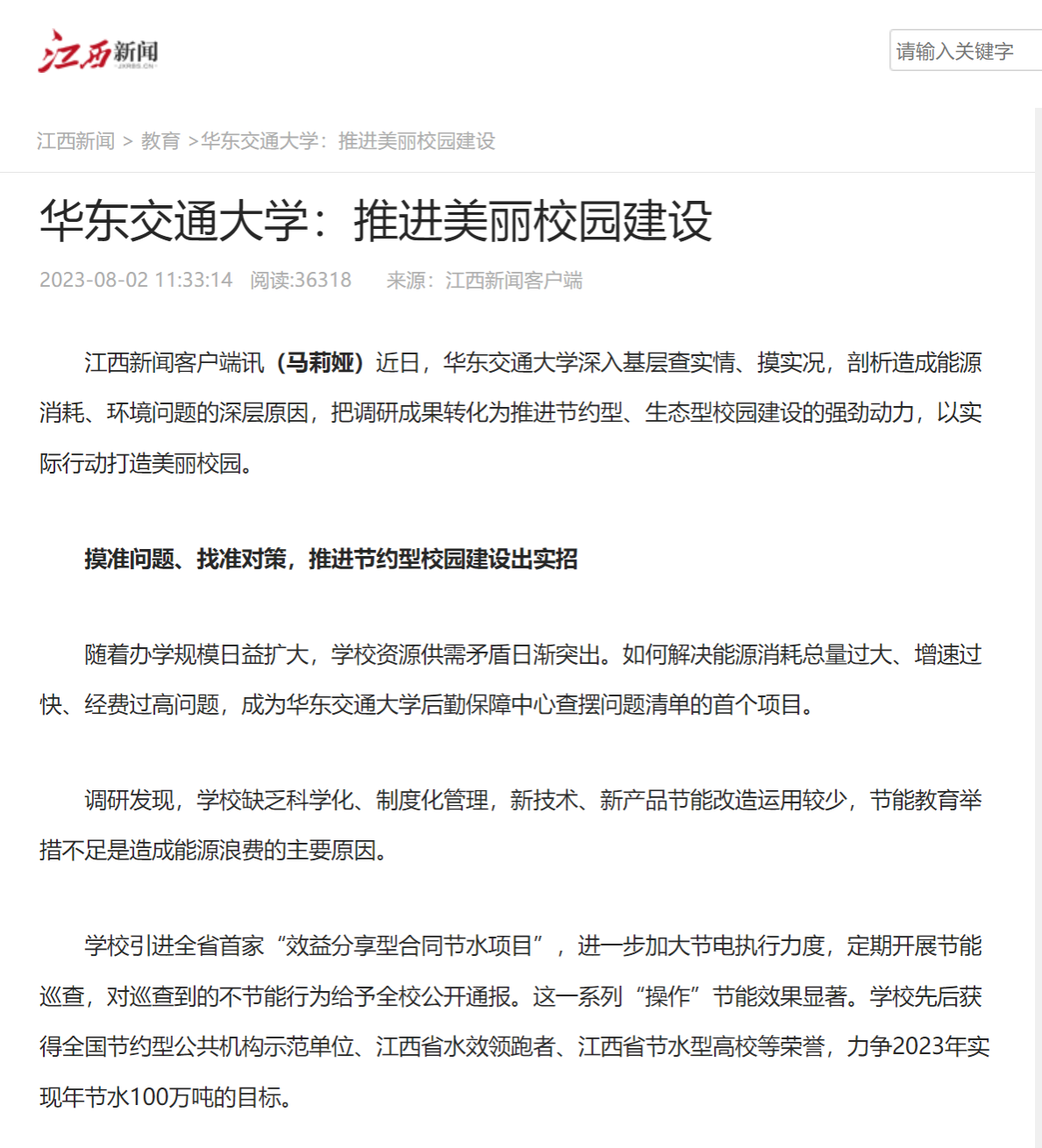 学校引进全省首家“效益分享型合同节水项目”,进一步加大节电执行力度,定期开展节能巡查,对巡查到的不节能行为给予全校公开通报。这一系列“操作”节能效果显著。学校先后获得全国节约型公共机构示范单位、江西省水效领跑者、江西省节水型高校等荣誉,力争2023年实现年节水100万吨的目标。