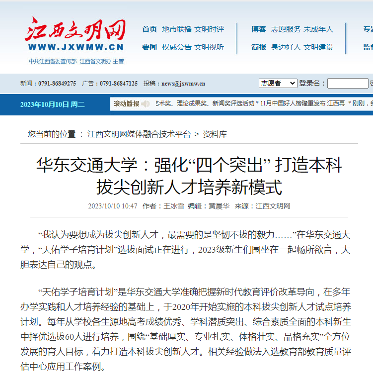 拔尖创新人才培养是一项长期性、系统性的工程。学校始终将人才培养质量作为衡量立德树人实效的重要标尺,坚持做好顶层设计、统筹推进,形成了党委统一领导、党政齐抓共管、部门协同联动、院系共同推进的工作格局,解决了培养举措落实过程中专业间分离、院系间分隔、部门与院系间分治现象,实现了学校、院系、师生各个层面在思想上同心、在目标上同向、在行动上同行,为学生们的成长发展保驾护航。近日获评“全国大学生自强之星”的“天佑学子”何政毅说:“是学校不断创新的培养模式给我创造了成长发展的平台,我的梦想在这里扬帆启航,未来我将再接再厉,为建设科技强国贡献青春力量。”