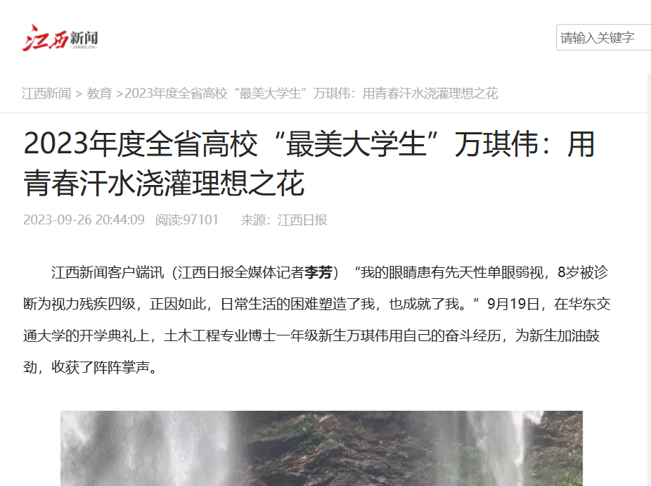 万琪伟出生在南昌一个贫困的农民家庭,他身残志坚,自强不息,比同龄人懂事得更早,学习也非常刻苦。“我始终相信知识能改变命运,也坚信在求知路上一定能收获属于自己的风景。”万琪伟说。
