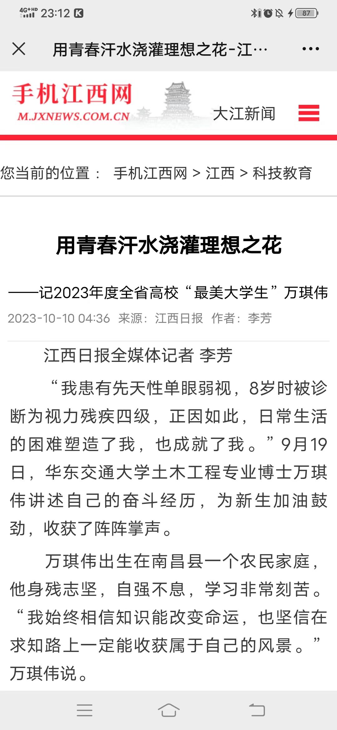 万琪伟出生在南昌县一个农民家庭,他身残志坚,自强不息,学习非常刻苦。“我始终相信知识能改变命运,也坚信在求知路上一定能收获属于自己的风景。”万琪伟说。