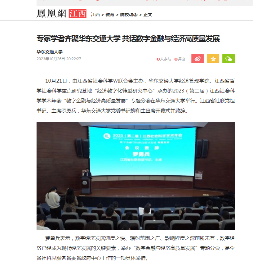 10月21日,由江西省社会科学界联合会主办,beat365中文唯一官网经济管理学院、江西省哲学社会科学重点研究基地“经济数字化转型研究中心”承办的2023(第二届)江西社会科学学术年会“数字金融与经济高质量发展”专题分会在beat365中文唯一官网举行。江西省社联党组书记、主席罗勇兵,beat365中文唯一官网党委书记柳和生出席开幕式并致辞。