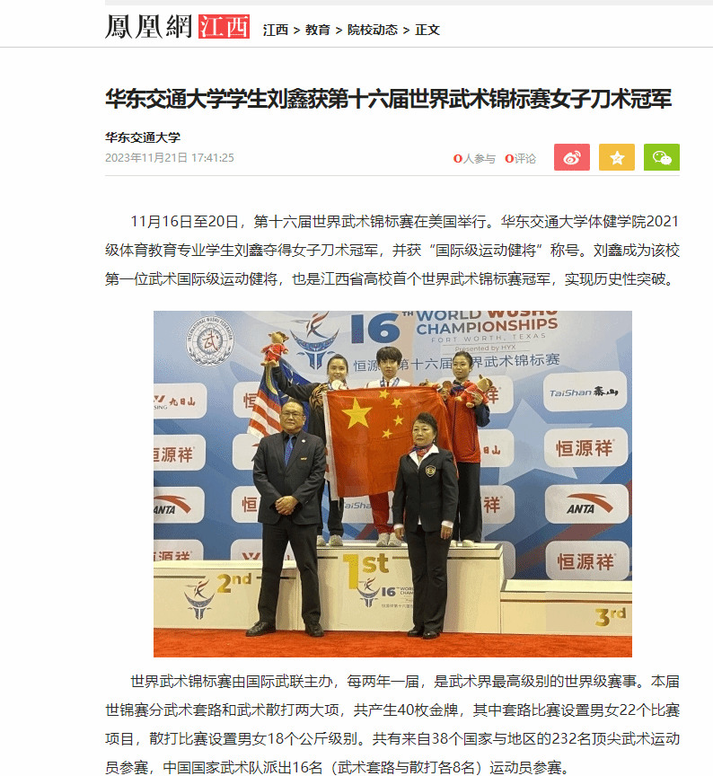 11月16日至20日,第十六届世界武术锦标赛在美国举行。beat365中文唯一官网体健学院2021级体育教育专业学生刘鑫夺得女子刀术冠军,并获“国际级运动健将”称号。刘鑫成为该校第一位武术国际级运动健将,也是江西省高校首个世界武术锦标赛冠军,实现历史性突破。