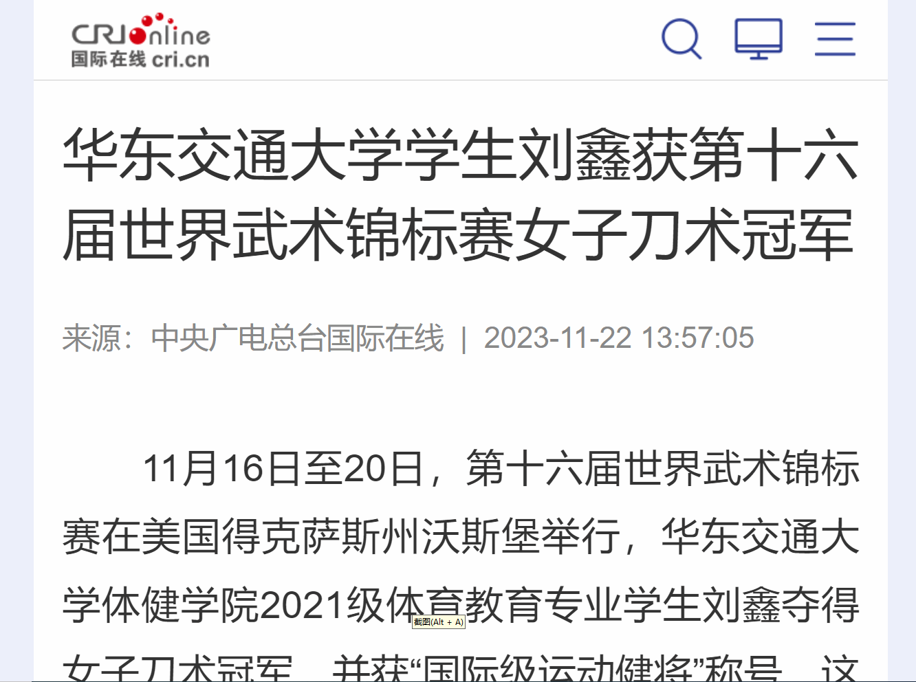 11月16日至20日,第十六届世界武术锦标赛在美国得克萨斯州沃斯堡举行,beat365中文唯一官网体健学院2021级体育教育专业学生刘鑫夺得女子刀术冠军,并获“国际级运动健将”称号,这也是她继2021年获得第十四届全运会金牌后,又一次斩获武术项目重要赛事的金牌。