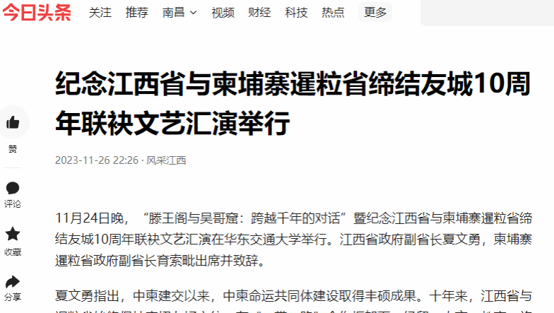 育索毗表示,此次文化交流活动是暹粒省和江西省之间兄弟般友谊的生动体现。江西拥有滕王阁,暹粒有吴哥窟,双方在保护文化遗产以及促进文旅合作方面有着巨大的潜力。期待未来两省友好关系更进一步、合作更加密切。