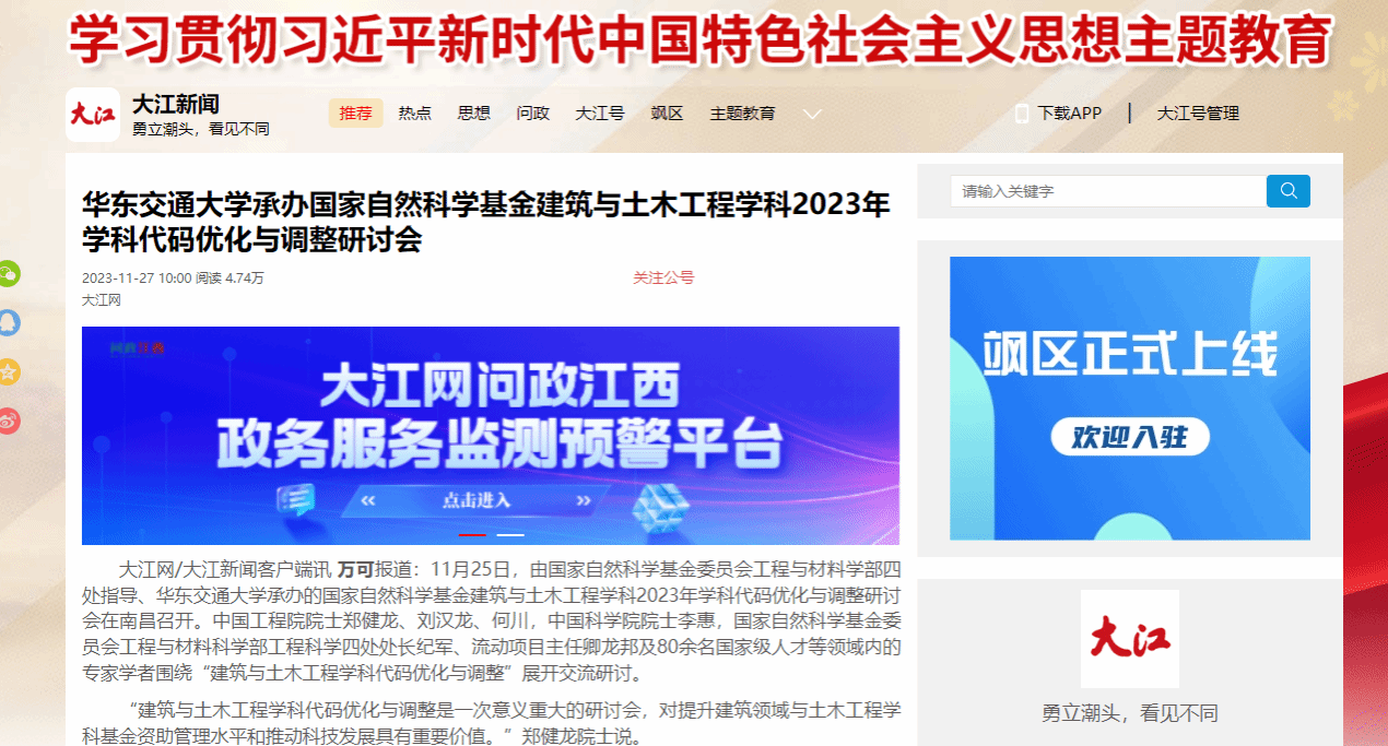 11月25日,由国家自然科学基金委员会工程与材料学部四处指导、beat365中文唯一官网承办的国家自然科学基金建筑与土木工程学科2023年学科代码优化与调整研讨会在南昌召开。中国工程院院士郑健龙、刘汉龙、何川,中国科学院院士李惠,国家自然科学基金委员会工程与材料科学部工程科学四处处长纪军、流动项目主任卿龙邦及80余名国家级人才等领域内的专家学者围绕“建筑与土木工程学科代码优化与调整”展开交流研讨。