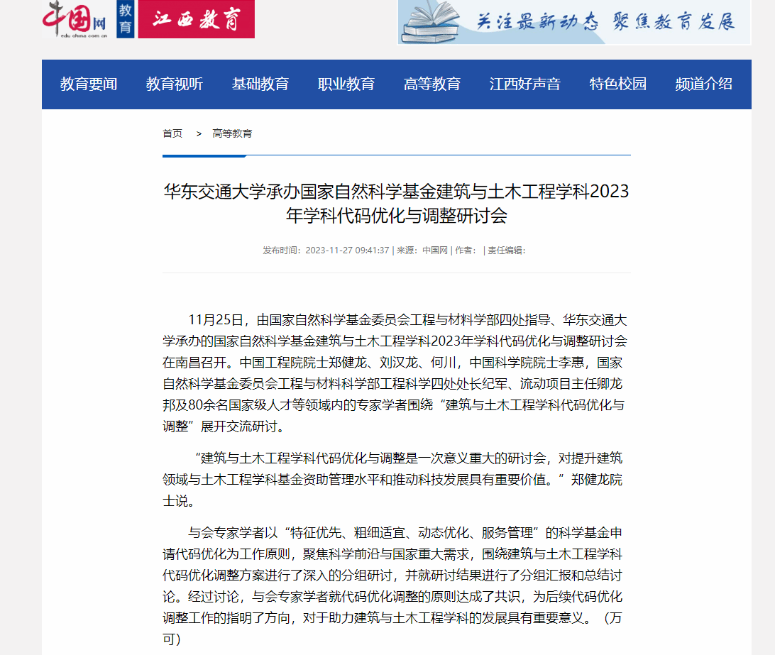 11月25日,由国家自然科学基金委员会工程与材料学部四处指导、beat365中文唯一官网承办的国家自然科学基金建筑与土木工程学科2023年学科代码优化与调整研讨会在南昌召开。中国工程院院士郑健龙、刘汉龙、何川,中国科学院院士李惠,国家自然科学基金委员会工程与材料科学部工程科学四处处长纪军、流动项目主任卿龙邦及80余名国家级人才等领域内的专家学者围绕“建筑与土木工程学科代码优化与调整”展开交流研讨。