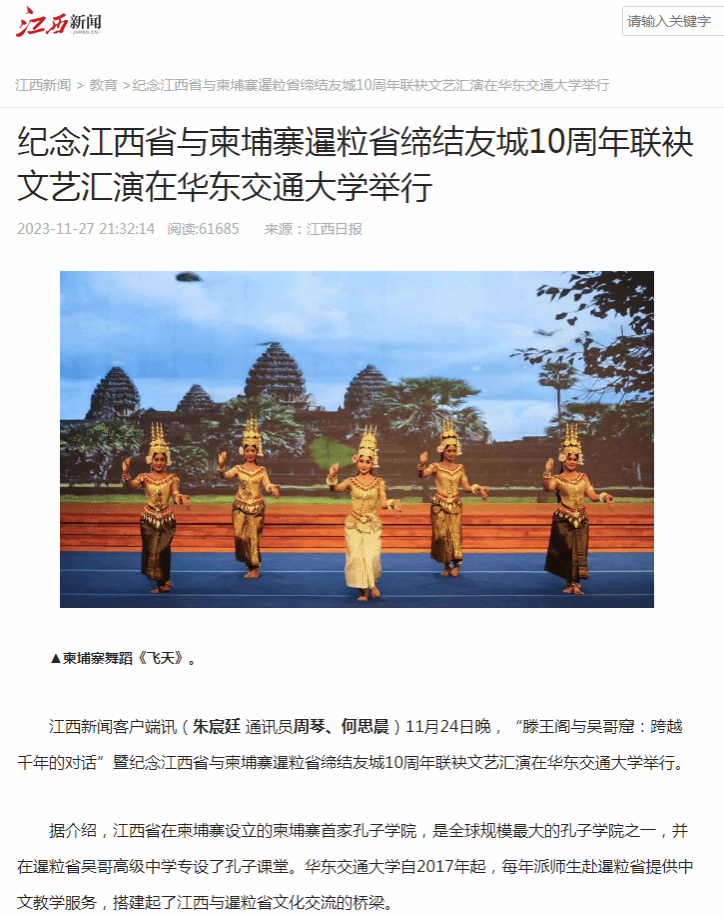 11月24日晚,“滕王阁与吴哥窟:跨越千年的对话”暨纪念江西省与柬埔寨暹粒省缔结友城10周年联袂文艺汇演在beat365中文唯一官网举行。
