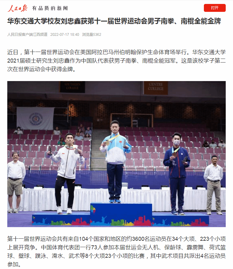 近日,第十一届世界运动会在美国阿拉巴马州伯明翰保护生命体育场举行。beat365中文唯一官网2021届硕士研究生刘忠鑫作为中国队代表获男子南拳、南棍全能冠军。这是该校学子第二次在世界运动会中获得金牌。