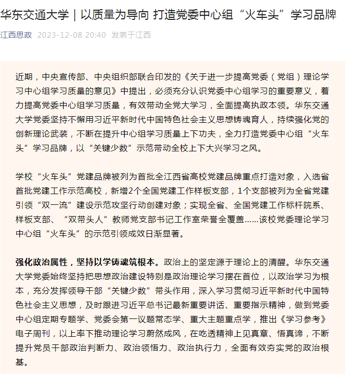 学校“火车头”党建品牌被列为首批全江西省高校党建品牌重点打造对象,入选省首批党建工作示范高校,新增2个全国党建工作样板支部,1个支部被列为全省党建引领“双一流”建设示范攻坚行动创建对象;实现全省、全国党建工作标杆院系、样板支部、“双带头人”教师党支部书记工作室荣誉全覆盖……该校党委理论学习中心组“火车头”的示范引领成效日渐显著。