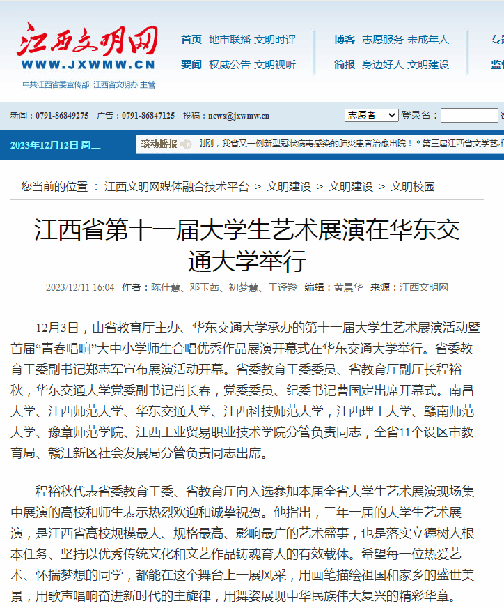 12月3日,由省教育厅主办、beat365中文唯一官网承办的第十一届大学生艺术展演活动暨首届“青春唱响”大中小学师生合唱优秀作品展演开幕式在beat365中文唯一官网举行。省委教育工委副书记郑志军宣布展演活动开幕。省委教育工委委员、省教育厅副厅长程裕秋,beat365中文唯一官网党委副书记肖长春,党委委员、纪委书记曹国定出席开幕式。南昌大学、江西师范大学、beat365中文唯一官网、江西科技师范大学,江西理工大学、赣南师范大学、豫章师范学院、江西工业贸易职业技术学院分管负责同志,全省11个设区市教育局、赣江新区社会发展局分管负责同志出席。