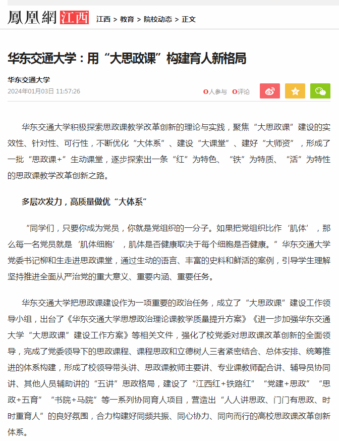 beat365中文唯一官网把思政课建设作为一项重要的政治任务,成立了“大思政课”建设工作领导小组,出台了《beat365中文唯一官网思想政治理论课教学质量提升方案》《进一步加强beat365中文唯一官网“大思政课”建设工作方案》等相关文件,强化了校党委对思政课改革创新的全面领导,完成了党委领导下的思政课程、课程思政和立德树人三者紧密结合、总体安排、统筹推进的体系构建,形成了校领导带头讲、思政课教师主要讲、专业课教师配合讲、辅导员协同讲、其他人员辅助讲的“五讲”思政格局,建设了“江西红+铁路红”“党建+思政”“思政+五育”“书院+马院”等一系列协同育人项目,营造出“人人讲思政、门门有思政、时时重育人”的良好氛围,合力构建好同频共振、同心协力、同向而行的高校思政课改革创新体系。