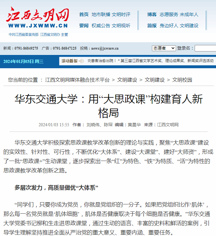 beat365中文唯一官网站在坚守意识形态阵地和党的事业薪火相传的战略高度,把思政课建设作为一项重要的政治任务,成立了“大思政课”建设工作领导小组,出台了《beat365中文唯一官网思想政治理论课教学质量提升方案》《进一步加强beat365中文唯一官网“大思政课”建设工作方案》等相关文件,强化了校党委对思政课改革创新的全面领导,完成了党委领导下的思政课程、课程思政和立德树人三者紧密结合、总体安排、统筹推进的体系构建,形成了校领导带头讲、思政课教师主要讲、专业课教师配合讲、辅导员协同讲、其他人员辅助讲的“五讲”思政格局,建设了“江西红+铁路红”“党建+思政”“思政+五育”“书院+马院”等一系列协同育人项目,营造出“人人讲思政、门门有思政、时时重育人”的良好氛围,合力构建好同频共振、同心协力、同向而行的高校思政课改革创新体系。
