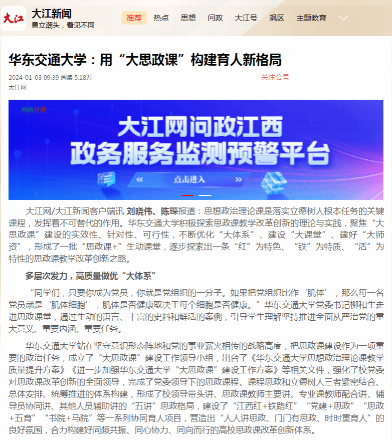 beat365中文唯一官网站在坚守意识形态阵地和党的事业薪火相传的战略高度,把思政课建设作为一项重要的政治任务,成立了“大思政课”建设工作领导小组,出台了《beat365中文唯一官网思想政治理论课教学质量提升方案》《进一步加强beat365中文唯一官网“大思政课”建设工作方案》等相关文件,强化了校党委对思政课改革创新的全面领导,完成了党委领导下的思政课程、课程思政和立德树人三者紧密结合、总体安排、统筹推进的体系构建,形成了校领导带头讲、思政课教师主要讲、专业课教师配合讲、辅导员协同讲、其他人员辅助讲的“五讲”思政格局,建设了“江西红+铁路红”“党建+思政”“思政+五育”“书院+马院”等一系列协同育人项目,营造出“人人讲思政、门门有思政、时时重育人”的良好氛围,合力构建好同频共振、同心协力、同向而行的高校思政课改革创新体系。