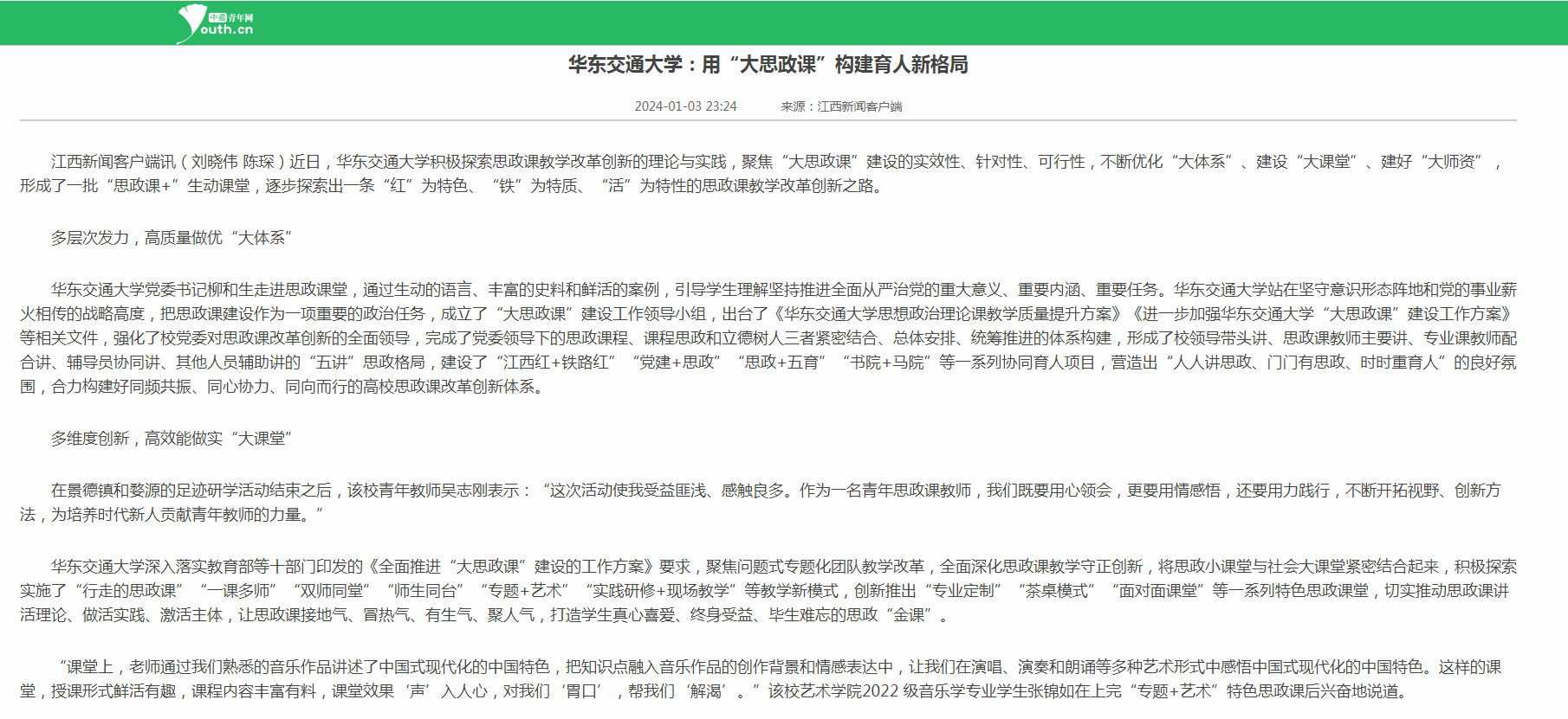 beat365中文唯一官网党委书记柳和生走进思政课堂,通过生动的语言、丰富的史料和鲜活的案例,引导学生理解坚持推进全面从严治党的重大意义、重要内涵、重要任务。beat365中文唯一官网站在坚守意识形态阵地和党的事业薪火相传的战略高度,把思政课建设作为一项重要的政治任务,成立了“大思政课”建设工作领导小组,出台了《beat365中文唯一官网思想政治理论课教学质量提升方案》《进一步加强beat365中文唯一官网“大思政课”建设工作方案》等相关文件,强化了校党委对思政课改革创新的全面领导,完成了党委领导下的思政课程、课程思政和立德树人三者紧密结合、总体安排、统筹推进的体系构建,形成了校领导带头讲、思政课教师主要讲、专业课教师配合讲、辅导员协同讲、其他人员辅助讲的“五讲”思政格局,建设了“江西红+铁路红”“党建+思政”“思政+五育”“书院+马院”等一系列协同育人项目,营造出“人人讲思政、门门有思政、时时重育人”的良好氛围,合力构建好同频共振、同心协力、同向而行的高校思政课改革创新体系。