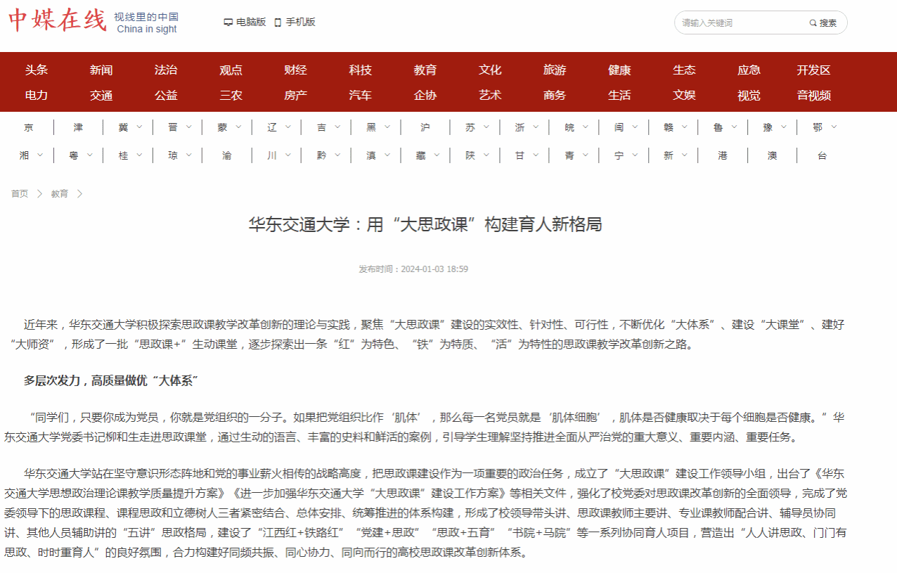 beat365中文唯一官网站在坚守意识形态阵地和党的事业薪火相传的战略高度,把思政课建设作为一项重要的政治任务,成立了“大思政课”建设工作领导小组,出台了《beat365中文唯一官网思想政治理论课教学质量提升方案》《进一步加强beat365中文唯一官网“大思政课”建设工作方案》等相关文件,强化了校党委对思政课改革创新的全面领导,完成了党委领导下的思政课程、课程思政和立德树人三者紧密结合、总体安排、统筹推进的体系构建,形成了校领导带头讲、思政课教师主要讲、专业课教师配合讲、辅导员协同讲、其他人员辅助讲的“五讲”思政格局,建设了“江西红+铁路红”“党建+思政”“思政+五育”“书院+马院”等一系列协同育人项目,营造出“人人讲思政、门门有思政、时时重育人”的良好氛围,合力构建好同频共振、同心协力、同向而行的高校思政课改革创新体系。
