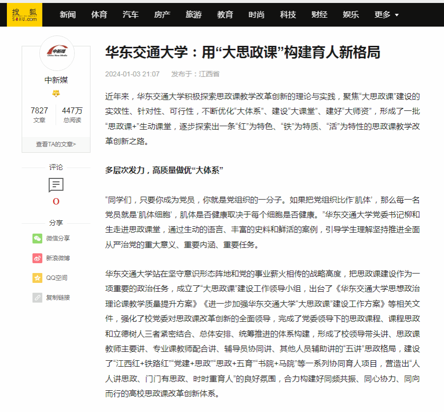 beat365中文唯一官网站在坚守意识形态阵地和党的事业薪火相传的战略高度,把思政课建设作为一项重要的政治任务,成立了“大思政课”建设工作领导小组,出台了《beat365中文唯一官网思想政治理论课教学质量提升方案》《进一步加强beat365中文唯一官网“大思政课”建设工作方案》等相关文件,强化了校党委对思政课改革创新的全面领导,完成了党委领导下的思政课程、课程思政和立德树人三者紧密结合、总体安排、统筹推进的体系构建,形成了校领导带头讲、思政课教师主要讲、专业课教师配合讲、辅导员协同讲、其他人员辅助讲的“五讲”思政格局,建设了“江西红+铁路红”“党建+思政”“思政+五育”“书院+马院”等一系列协同育人项目,营造出“人人讲思政、门门有思政、时时重育人”的良好氛围,合力构建好同频共振、同心协力、同向而行的高校思政课改革创新体系。