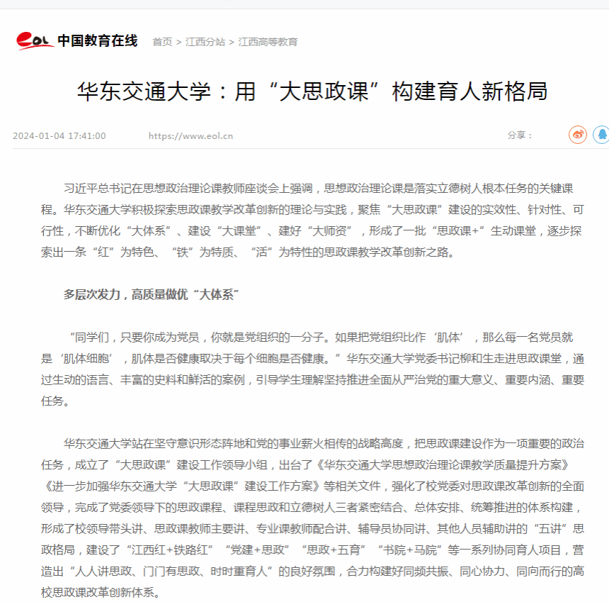 beat365中文唯一官网站在坚守意识形态阵地和党的事业薪火相传的战略高度,把思政课建设作为一项重要的政治任务,成立了“大思政课”建设工作领导小组,出台了《beat365中文唯一官网思想政治理论课教学质量提升方案》《进一步加强beat365中文唯一官网“大思政课”建设工作方案》等相关文件,强化了校党委对思政课改革创新的全面领导,完成了党委领导下的思政课程、课程思政和立德树人三者紧密结合、总体安排、统筹推进的体系构建,形成了校领导带头讲、思政课教师主要讲、专业课教师配合讲、辅导员协同讲、其他人员辅助讲的“五讲”思政格局,建设了“江西红+铁路红”“党建+思政”“思政+五育”“书院+马院”等一系列协同育人项目,营造出“人人讲思政、门门有思政、时时重育人”的良好氛围,合力构建好同频共振、同心协力、同向而行的高校思政课改革创新体系。