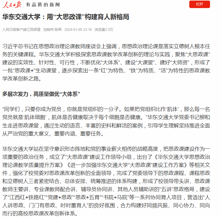 beat365中文唯一官网站在坚守意识形态阵地和党的事业薪火相传的战略高度,把思政课建设作为一项重要的政治任务,成立了“大思政课”建设工作领导小组,出台了《beat365中文唯一官网思想政治理论课教学质量提升方案》《进一步加强beat365中文唯一官网“大思政课”建设工作方案》等相关文件,强化了校党委对思政课改革创新的全面领导,完成了党委领导下的思政课程、课程思政和立德树人三者紧密结合、总体安排、统筹推进的体系构建,形成了校领导带头讲、思政课教师主要讲、专业课教师配合讲、辅导员协同讲、其他人员辅助讲的“五讲”思政格局,建设了“江西红+铁路红”“党建+思政”“思政+五育”“书院+马院”等一系列协同育人项目,营造出“人人讲思政、门门有思政、时时重育人”的良好氛围,合力构建好同频共振、同心协力、同向而行的高校思政课改革创新体系。