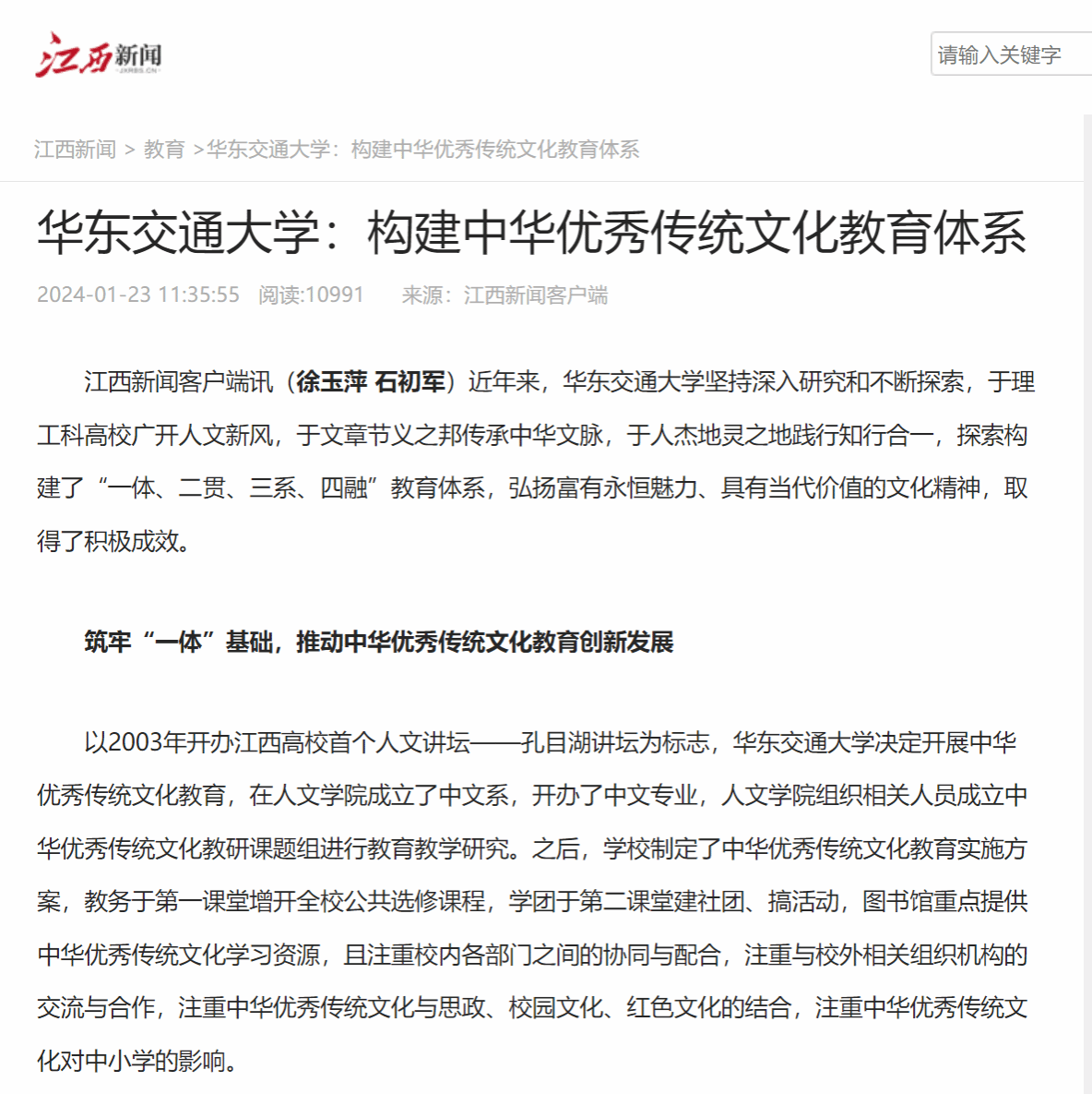 以2003年开办江西高校首个人文讲坛——孔目湖讲坛为标志,beat365中文唯一官网决定开展中华优秀传统文化教育,在人文学院成立了中文系,开办了中文专业,人文学院组织相关人员成立中华优秀传统文化教研课题组进行教育教学研究。之后,学校制定了中华优秀传统文化教育实施方案,教务于第一课堂增开全校公共选修课程,学团于第二课堂建社团、搞活动,图书馆重点提供中华优秀传统文化学习资源,且注重校内各部门之间的协同与配合,注重与校外相关组织机构的交流与合作,注重中华优秀传统文化与思政、校园文化、红色文化的结合,注重中华优秀传统文化对中小学的影响。