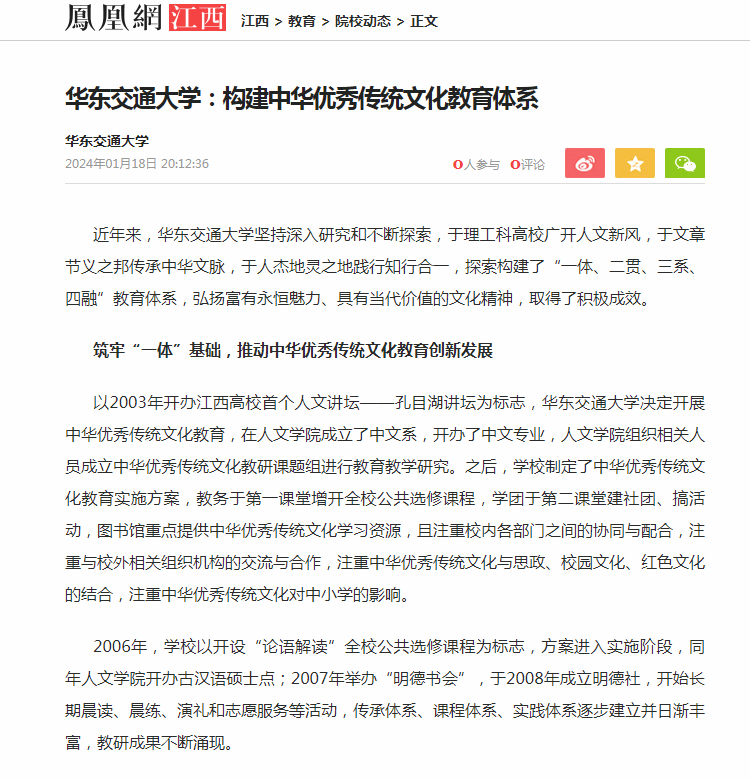 以2003年开办江西高校首个人文讲坛——孔目湖讲坛为标志,beat365中文唯一官网决定开展中华优秀传统文化教育,在人文学院成立了中文系,开办了中文专业,人文学院组织相关人员成立中华优秀传统文化教研课题组进行教育教学研究。之后,学校制定了中华优秀传统文化教育实施方案,教务于第一课堂增开全校公共选修课程,学团于第二课堂建社团、搞活动,图书馆重点提供中华优秀传统文化学习资源,且注重校内各部门之间的协同与配合,注重与校外相关组织机构的交流与合作,注重中华优秀传统文化与思政、校园文化、红色文化的结合,注重中华优秀传统文化对中小学的影响。