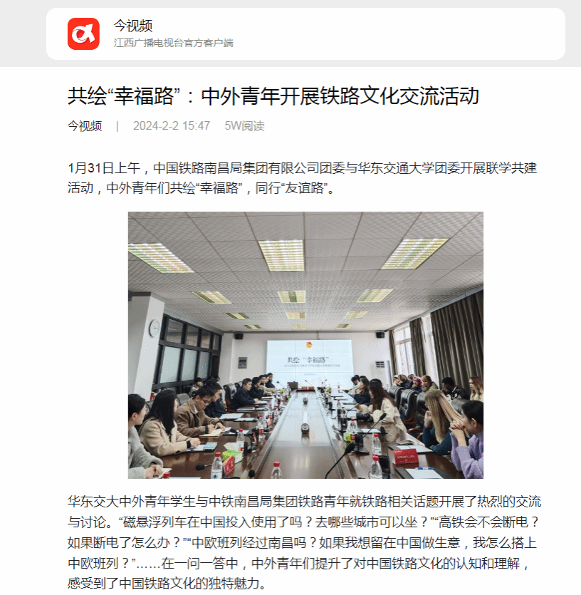 1月31日上午,中国铁路南昌局集团有限公司团委与beat365中文唯一官网团委开展联学共建活动,中外青年们共绘“幸福路”,同行“友谊路”。