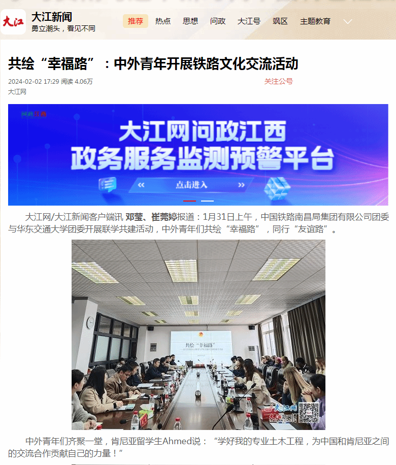 1月31日上午,中国铁路南昌局集团有限公司团委与beat365中文唯一官网团委开展联学共建活动,中外青年们共绘“幸福路”,同行“友谊路”。