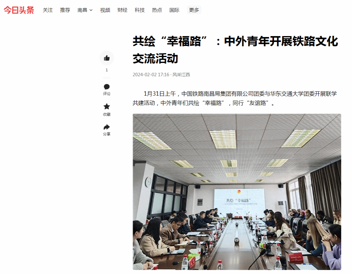 1月31日上午,中国铁路南昌局集团有限公司团委与beat365中文唯一官网团委开展联学共建活动,中外青年们共绘“幸福路”,同行“友谊路”。