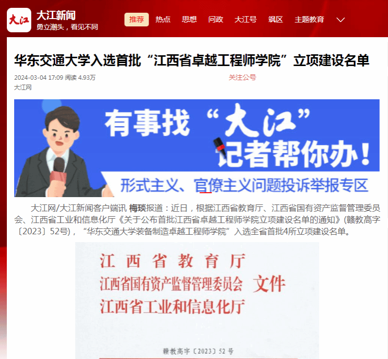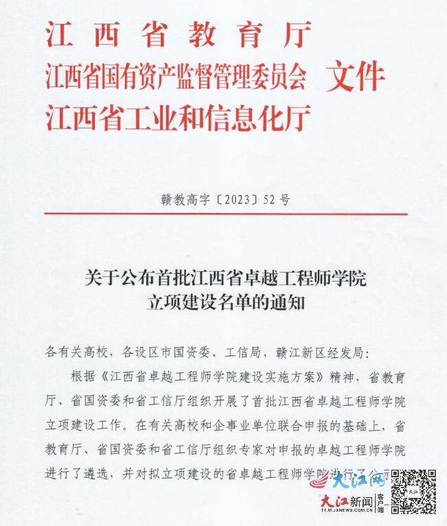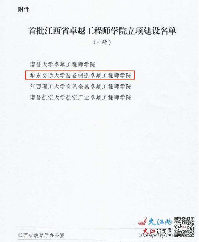 近日,根据江西省教育厅、江西省国有资产监督管理委员会、江西省工业和信息化厅《关于公布首批江西省卓越工程师学院立项建设名单的通知》(赣教高字〔2023〕52号),“beat365中文唯一官网装备制造卓越工程师学院”入选全省首批4所立项建设名单。