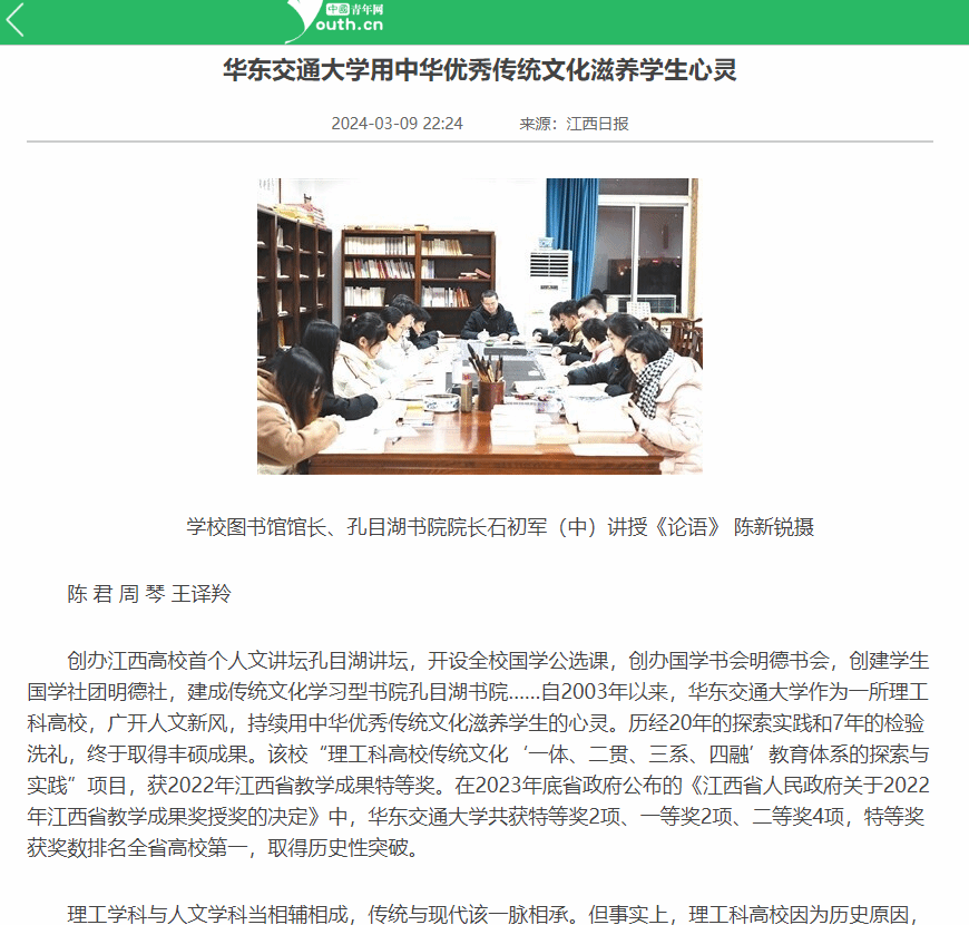 创办江西高校首个人文讲坛孔目湖讲坛,开设全校国学公选课,创办国学书会明德书会,创建学生国学社团明德社,建成传统文化学习型书院孔目湖书院……自2003年以来,beat365中文唯一官网作为一所理工科高校,广开人文新风,持续用中华优秀传统文化滋养学生的心灵。历经20年的探索实践和7年的检验洗礼,终于取得丰硕成果。该校“理工科高校传统文化‘一体、二贯、三系、四融’教育体系的探索与实践”项目,获2022年江西省教学成果特等奖。在2023年底省政府公布的《江西省人民政府关于2022年江西省教学成果奖授奖的决定》中,beat365中文唯一官网共获特等奖2项、一等奖2项、二等奖4项,特等奖获奖数排名全省高校第一,取得历史性突破。