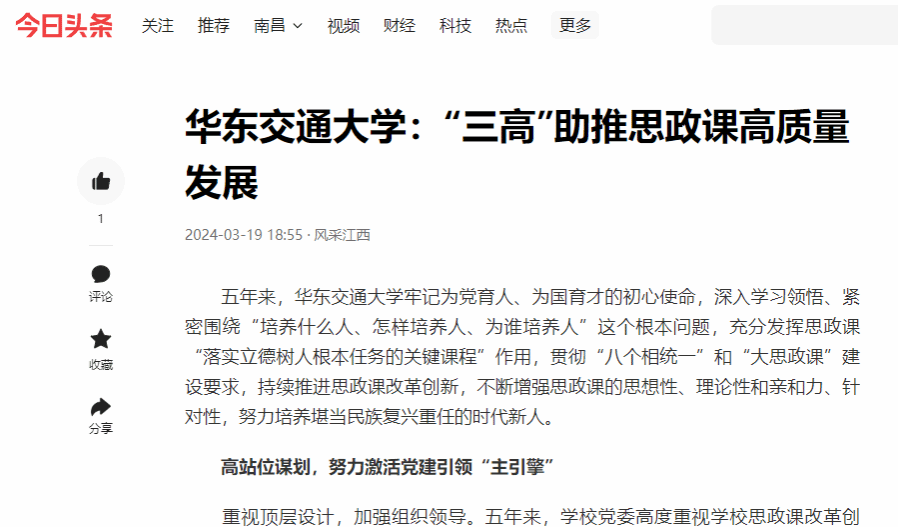 深耕教学改革,做优课程提升“抢答题”。五年来,围绕江西省问题式专题化团队教学改革要求,学校坚持以人才培养模式改革为重点,深化教学质量与教学改革,积极探索实施了“行走的思政课”“一课多师”“双师同堂”“师生同台”“专题+艺术”“实践研修+现场教学”等教学新模式,创新推出“专业定制”“茶桌模式”“面对面课堂”等一系列特色思政课堂,切实推动思政课讲活理论、做活实践、激活主体,让思政课接地气、冒热气、有生气、聚人气,打造学生真心喜爱、终身受益、毕生难忘的思政“金课”。