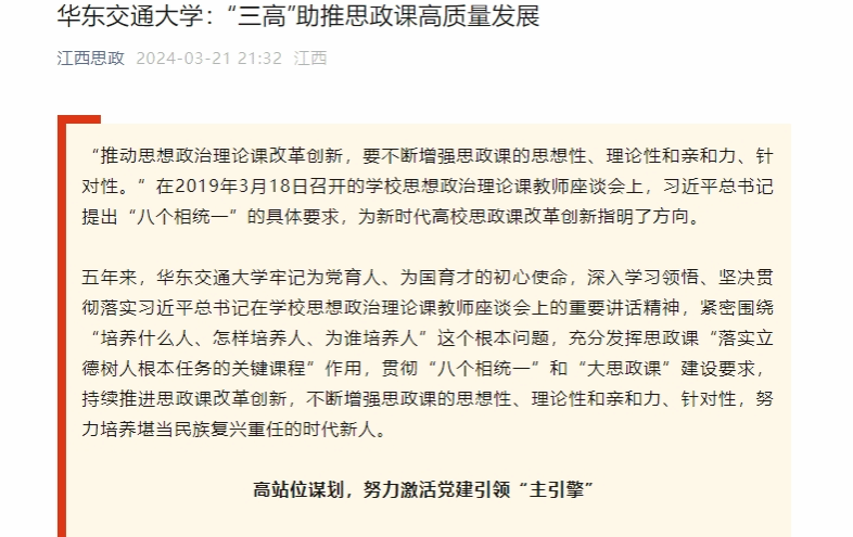 “推动思想政治理论课改革创新,要不断增强思政课的思想性、理论性和亲和力、针对性。”在2019年3月18日召开的学校思想政治理论课教师座谈会上,习近平总书记提出“八个相统一”的具体要求,为新时代高校思政课改革创新指明了方向。