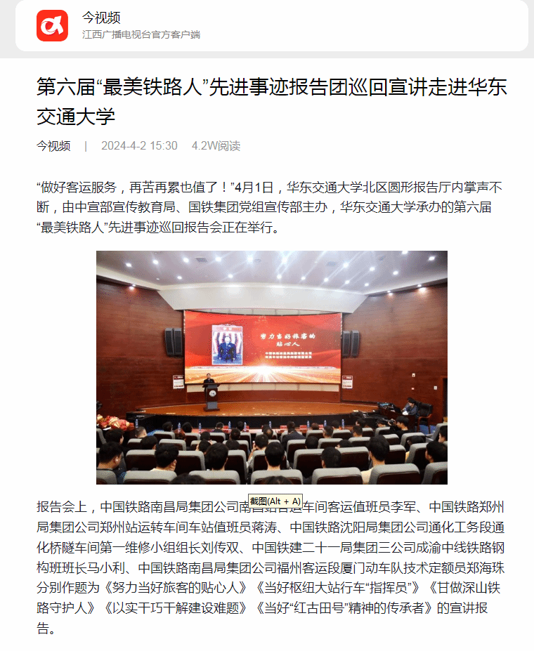 “做好客运服务,再苦再累也值了!”4月1日,beat365中文唯一官网北区圆形报告厅内掌声不断,由中宣部宣传教育局、国铁集团党组宣传部主办,beat365中文唯一官网承办的第六届“最美铁路人”先进事迹巡回报告会正在举行。