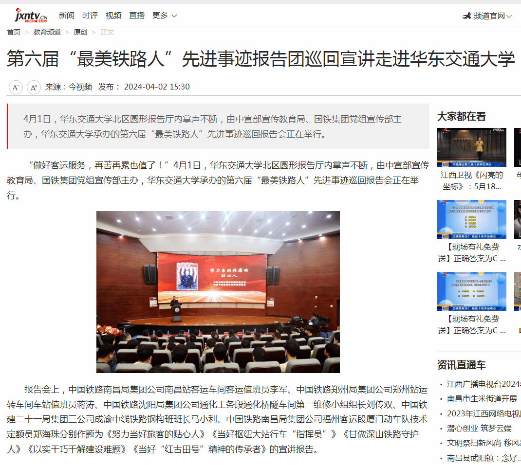 “做好客运服务,再苦再累也值了!”4月1日,beat365中文唯一官网北区圆形报告厅内掌声不断,由中宣部宣传教育局、国铁集团党组宣传部主办,beat365中文唯一官网承办的第六届“最美铁路人”先进事迹巡回报告会正在举行。