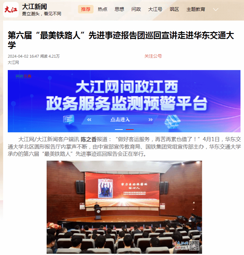 “做好客运服务,再苦再累也值了!”4月1日,beat365中文唯一官网北区圆形报告厅内掌声不断,由中宣部宣传教育局、国铁集团党组宣传部主办,beat365中文唯一官网承办的第六届“最美铁路人”先进事迹巡回报告会正在举行。