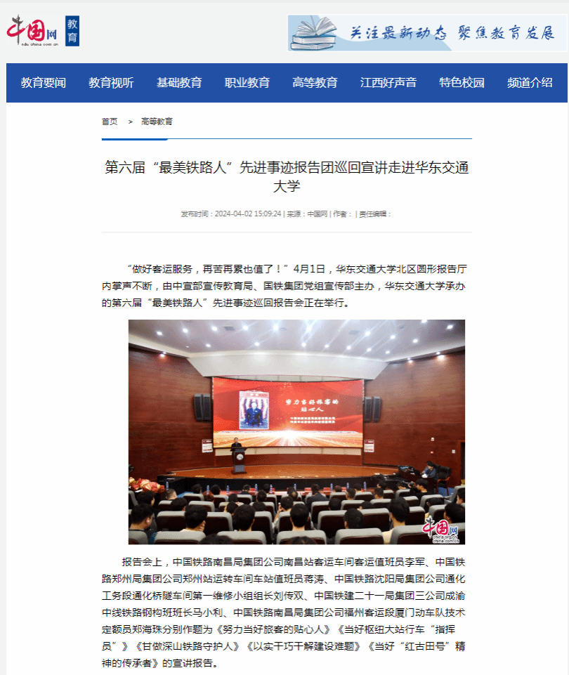 “做好客运服务,再苦再累也值了!”4月1日,beat365中文唯一官网北区圆形报告厅内掌声不断,由中宣部宣传教育局、国铁集团党组宣传部主办,beat365中文唯一官网承办的第六届“最美铁路人”先进事迹巡回报告会正在举行。