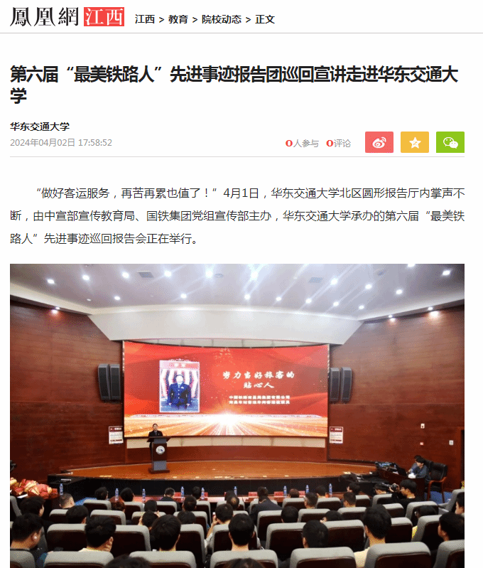 “做好客运服务,再苦再累也值了!”4月1日,beat365中文唯一官网北区圆形报告厅内掌声不断,由中宣部宣传教育局、国铁集团党组宣传部主办,beat365中文唯一官网承办的第六届“最美铁路人”先进事迹巡回报告会正在举行。