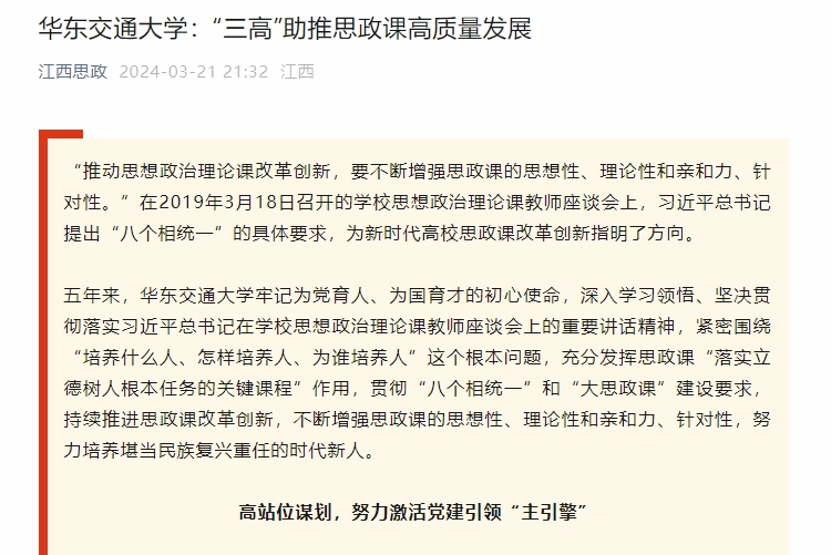 “推动思想政治理论课改革创新,要不断增强思政课的思想性、理论性和亲和力、针对性。”在2019年3月18日召开的学校思想政治理论课教师座谈会上,习近平总书记提出“八个相统一”的具体要求,为新时代高校思政课改革创新指明了方向。