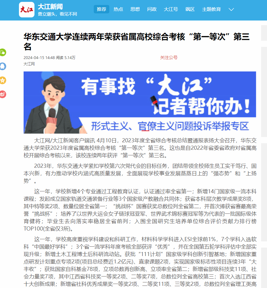 这一年,学校高度重视学科建设和科研工作,材料科学学科进入ESI全球前1%,7个学科入选软科“中国最好学科”;3个省一流学科年度考核全部获评“优秀”,并在全国第五轮学科评估中全部实现升级;新增土木工程博士后科研流动站。获批“111计划”国家级学科创新引智基地;新增国家重点研发计划重点专项2项(项目总经费近1.2亿元)、直隶课题2项,实现国家级标志性项目连续3年“大丰收”;获批国家自科基金78项,立项总数再创新高、立项率全省第二;新增省部级科技奖11项、社会力量奖7项,其中江西省科技奖一等奖2项、二等奖7项,总数位列全省高校第三;首次入选江西省十大创新成果;新增省社科优秀成果奖一等奖2项、二等奖11项、三等奖2项,总数位列全省理工类高校第二,创历史最好成绩。