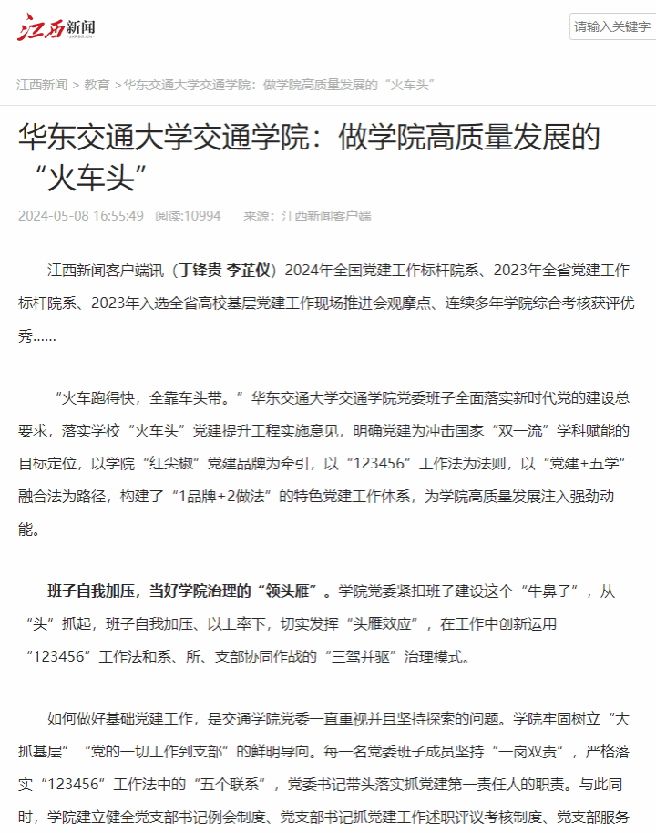 江西新闻客户端讯(丁锋贵 李芷仪)2024年全国党建工作标杆院系、2023年全省党建工作标杆院系、2023年入选全省高校基层党建工作现场推进会观摩点、连续多年学院综合考核获评优秀……