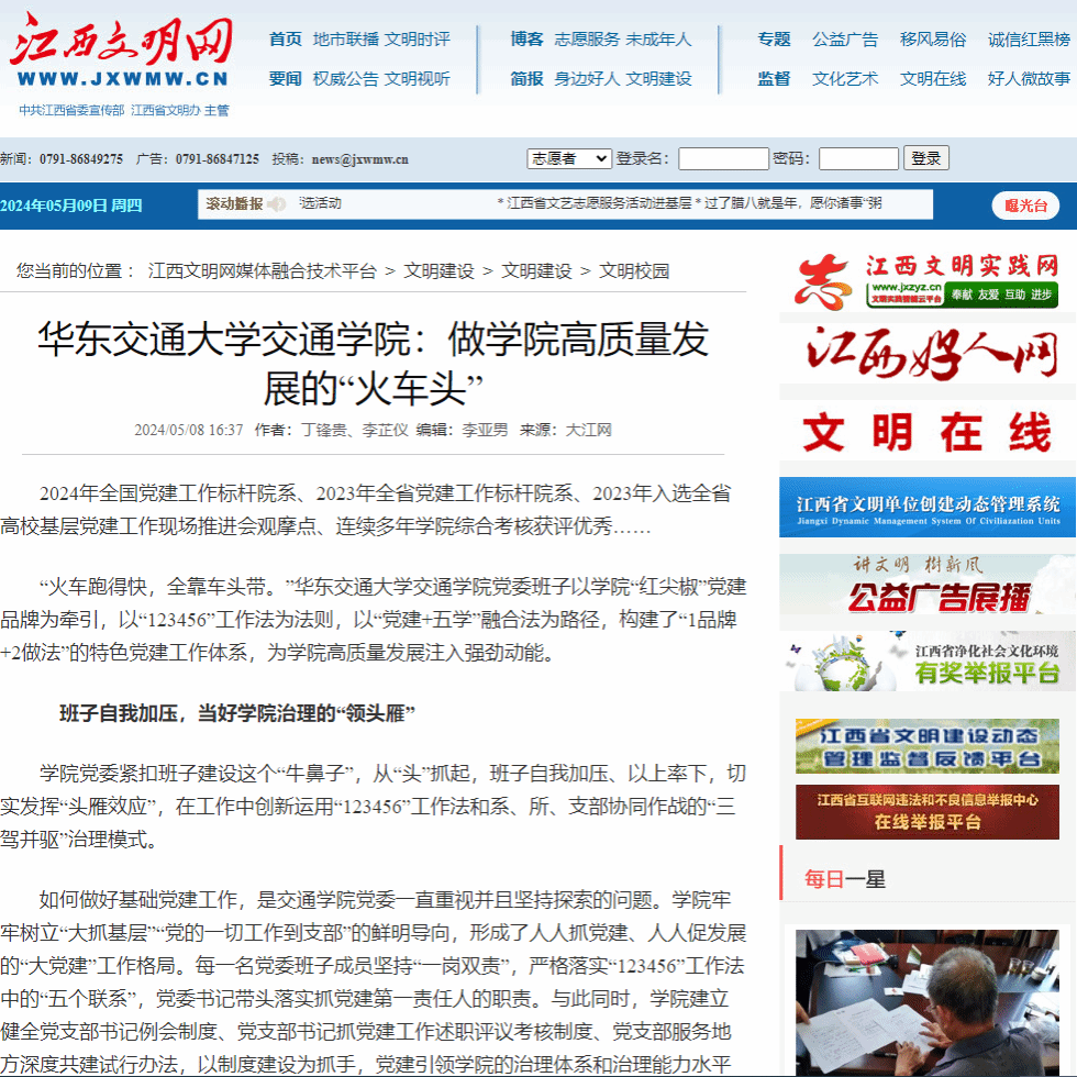 办大学就是办学科。学院党委始终坚持以一流党建引领一流学科发展,党委会和党政联席会议经常研究学科建设事宜。学院党委成立冲击国家“双一流”学科突击队党支部,动员各研究所党员教师带头勇挑重担,锻长板、补短板、固底板、树样板,持续发力。交通运输工程学科带头人申报的国家重点研发计划重点专项“铁路基础设施智能建造质量控制关键技术”项目获批,形成了推进科技创新的强大合力。学院党委鼓励党员教师积极服务地方经济社会发展,助力“交通强省”建设,首次承担中国工程院战略研究与咨询重大项目“江西省水路交通发展战略研究”的两个子课题并顺利通过综合绩效评价,出版发布全国首部以交通强省建设为主题的蓝皮书。交通运输工程学科也入选江西省一流学科(高峰优势学科),在全省一流学科考核中连续获评优秀,在第五轮学科评估中跨挡升级,入选了2023软科“中国最好学科”的前20%。