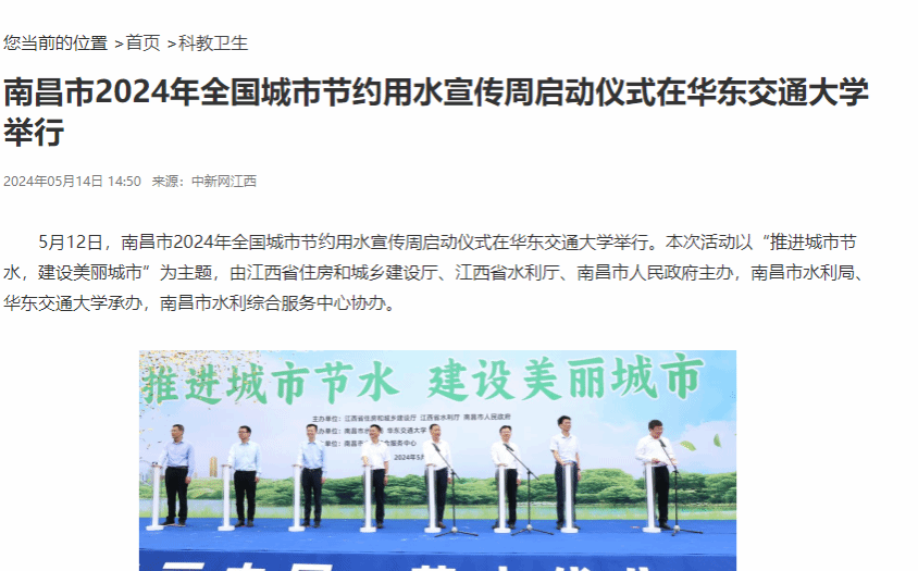 5月12日,南昌市2024年全国城市节约用水宣传周启动仪式在beat365中文唯一官网举行。本次活动以“推进城市节水,建设美丽城市”为主题,由江西省住房和城乡建设厅、江西省水利厅、南昌市人民政府主办,南昌市水利局、beat365中文唯一官网承办,南昌市水利综合服务中心协办。
