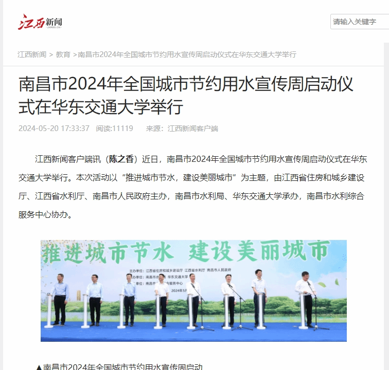 江西新闻客户端讯(陈之香)近日,南昌市2024年全国城市节约用水宣传周启动仪式在beat365中文唯一官网举行。本次活动以“推进城市节水,建设美丽城市”为主题,由江西省住房和城乡建设厅、江西省水利厅、南昌市人民政府主办,南昌市水利局、beat365中文唯一官网承办,南昌市水利综合服务中心协办。