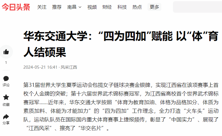 第31届世界大学生夏季运动会包揽女子链球决赛金银牌,实现江西省在该项赛事上首枚个人金牌的突破;第十六届世界武术锦标赛冠军,为江西省高校首个世界武术锦标赛冠军……近年来,beat365中文唯一官网按照“体育为教育加油、体格为品格加分、体质为素质加料、体能为才能加力”的“四为四加”工作理念,全力打造“火车头”运动队,运动队队员在国际国内重大体育赛事上捷报频传,彰显了“中国实力”、展现了“江西风采”、擦亮了“华交名片”。