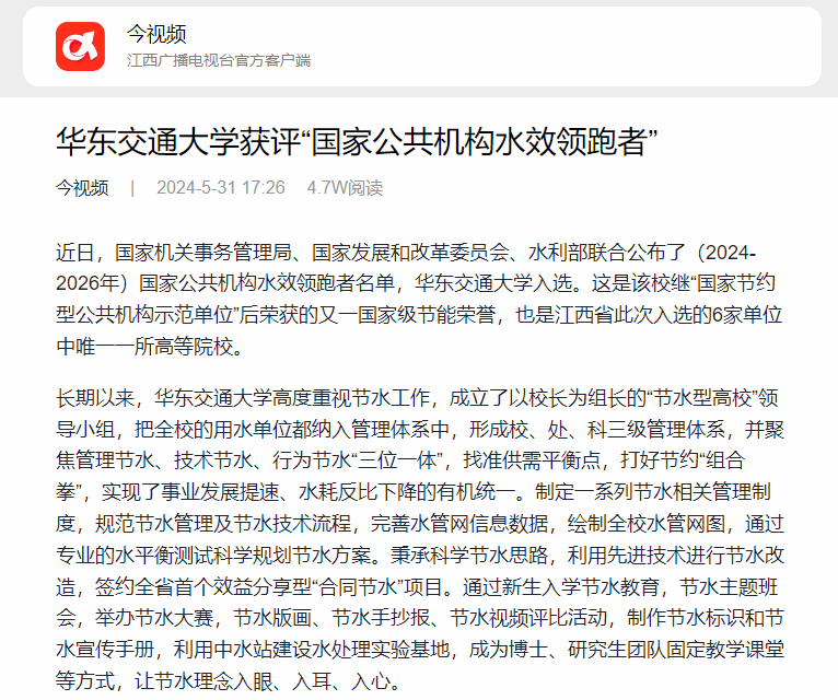 近日,国家机关事务管理局、国家发展和改革委员会、水利部联合公布了(2024-2026年)国家公共机构水效领跑者名单,beat365中文唯一官网入选。这是该校继“国家节约型公共机构示范单位”后荣获的又一国家级节能荣誉,也是江西省此次入选的6家单位中唯一一所高等院校。