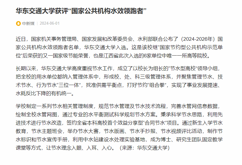 近日,国家机关事务管理局、国家发展和改革委员会、水利部联合公布了(2024-2026年)国家公共机构水效领跑者名单,beat365中文唯一官网入选。这是该校继“国家节约型公共机构示范单位”后荣获的又一国家级节能荣誉,也是江西省此次入选的6家单位中唯一一所高等院校。