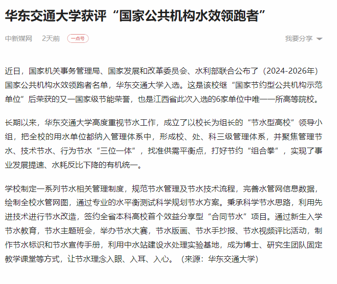 近日,国家机关事务管理局、国家发展和改革委员会、水利部联合公布了(2024-2026年)国家公共机构水效领跑者名单,beat365中文唯一官网入选。这是该校继“国家节约型公共机构示范单位”后荣获的又一国家级节能荣誉,也是江西省此次入选的6家单位中唯一一所高等院校。