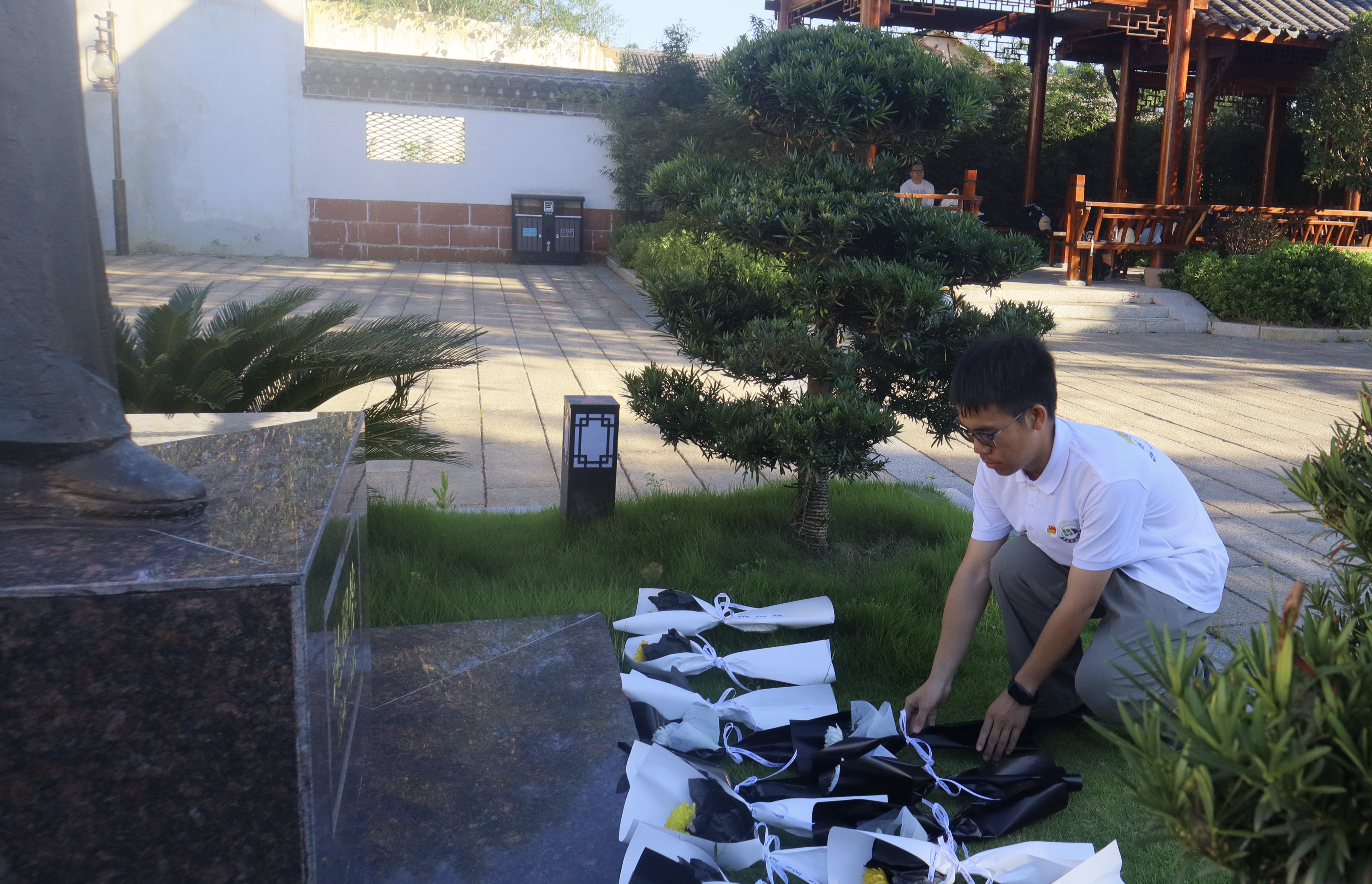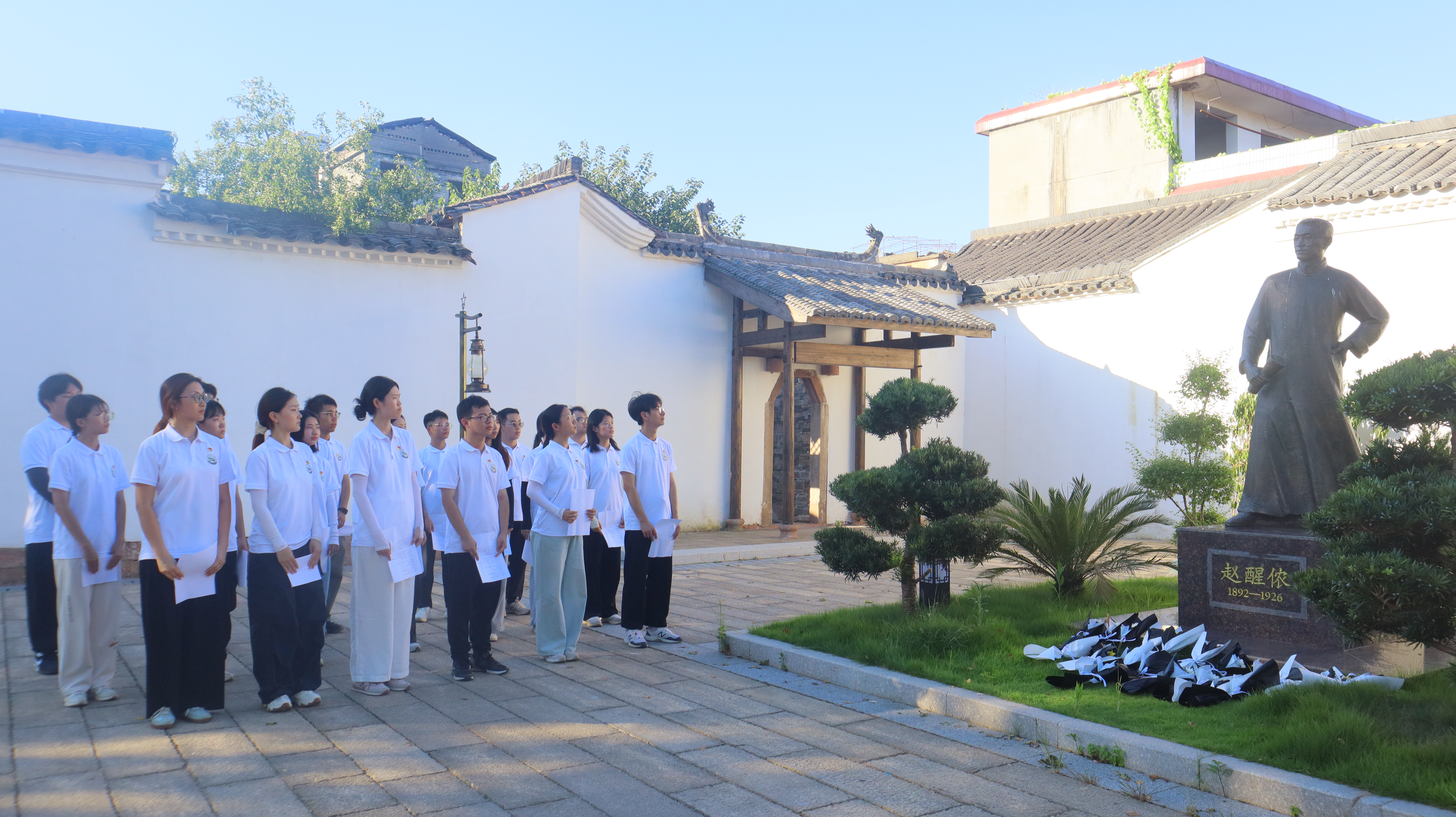颂扬先烈精神,鲜花敬献英魂。广场中央阳光和煦,赵醒侬雕像屹立其中,面容庄严而深邃,每一道刻痕都仿佛蕴含着历史的重量与不朽的精神。实践队成员们驻足凝视,心生敬意,队伍缓缓行至雕像前,向赵醒侬雕像敬献鲜花,鞠躬致敬。这不仅是对革命先驱的敬仰和缅怀,更是对红色精神的传承和弘扬。随后,实践队进行了诗朗诵,用饱满的热情和昂扬的语调,诉说着革命先辈的英雄事迹。这次活动不仅是对赵醒侬等革命先辈的致敬,更是一次深刻的爱国主义教育。“我们不仅要铭记‘七七事变’等历史事件,更要铭记那些为国家和民族献出生命的英雄们。他们的精神将永远照耀着我们前行的道路,激励着一代又一代人为实现中华民族伟大复兴而奋斗。”一位实践队成员说。